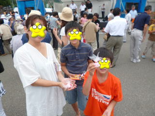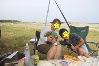 | ともかく餅投げ、なんだか新築祝いみたいだがこんな経験自分も初めて。なかなか楽しいし、子供にもいい経験になってしまった。 大きなスイカをお安く仕入れてしいれてしまった。今晩は砂浜でスイカ割か〜? |