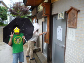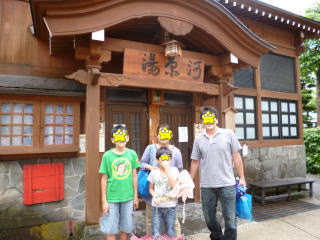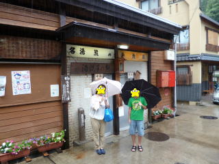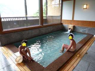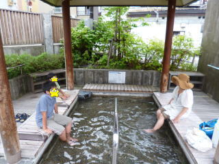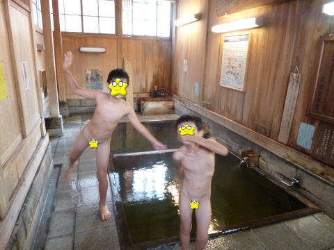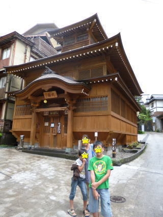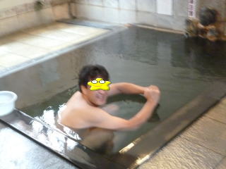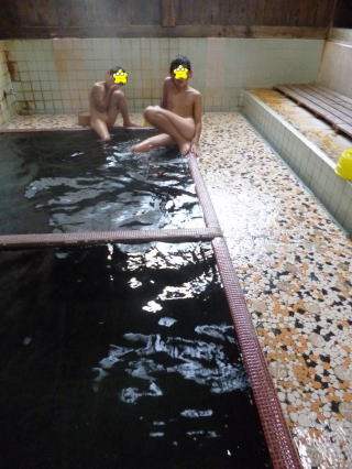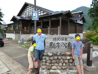 | さて入湯するのはその名も駒子の湯、またもや貸切です。いやあ、日焼けに激痛が走ります。 せっかく入ったのに子供が全く入ろうとしないので、この我慢大会に耐えた人はDS OKだよ〜のかけ、 げんきんなお子たちは地獄の痛みに耐えてスポッと入ってしまいました。 |