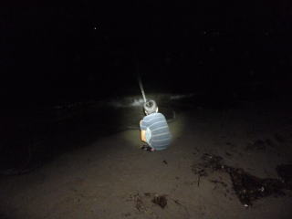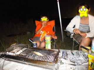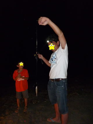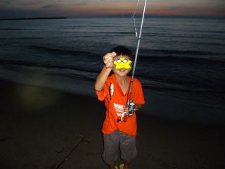 夜もふけて、買っておいたイソメで釣りをします。 お目当てはキスなのですが、釣れるのはフグばっか。 よくあるパターン。 まあ子供たちには釣れること自体が楽しいはずです。 |
